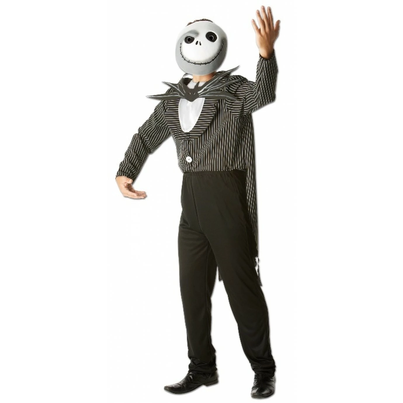 Costume includes jacket with mock shirt, detachable bat bow, trousers, and plastic face mask.