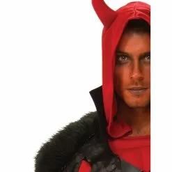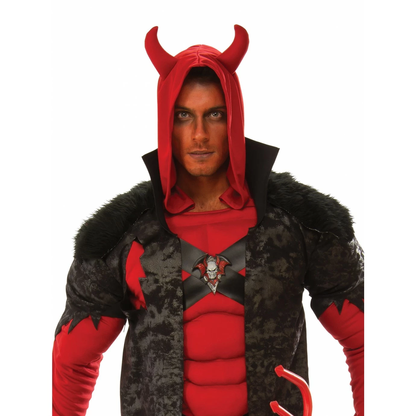 Costume includes fibre-stuffed muscle chest shirt with attached harnesses and pendant, attached velour jacket and faux-fur shoulder pads with stand up collar, and attached hood with horns.