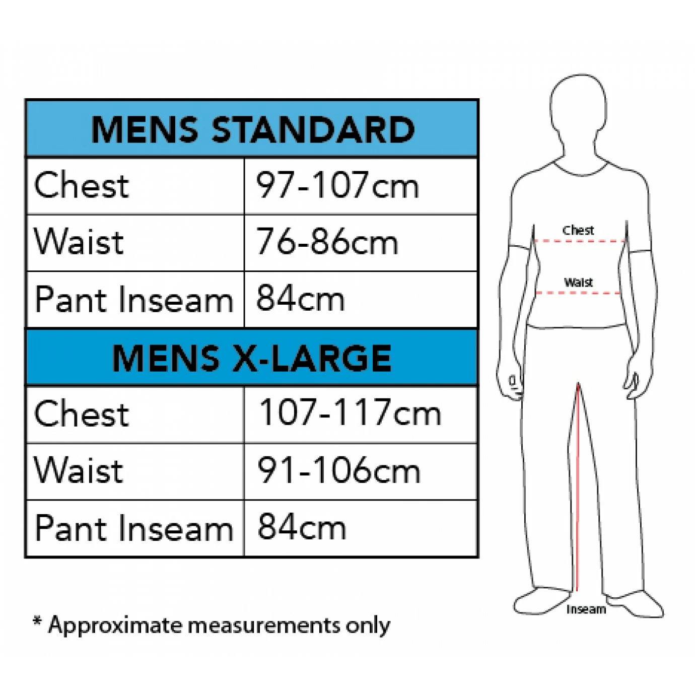 Standard – Chest 97 cm to 107 cm, waist 76 cm to 86 cm, inseam 84 cm.