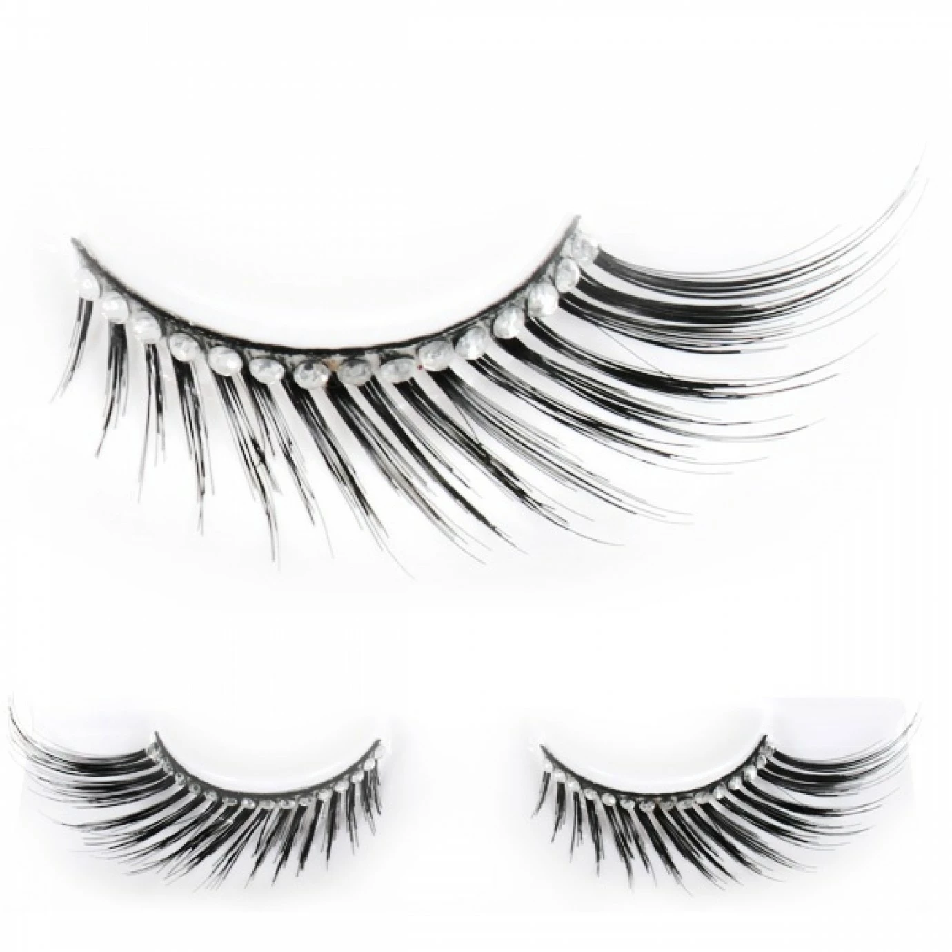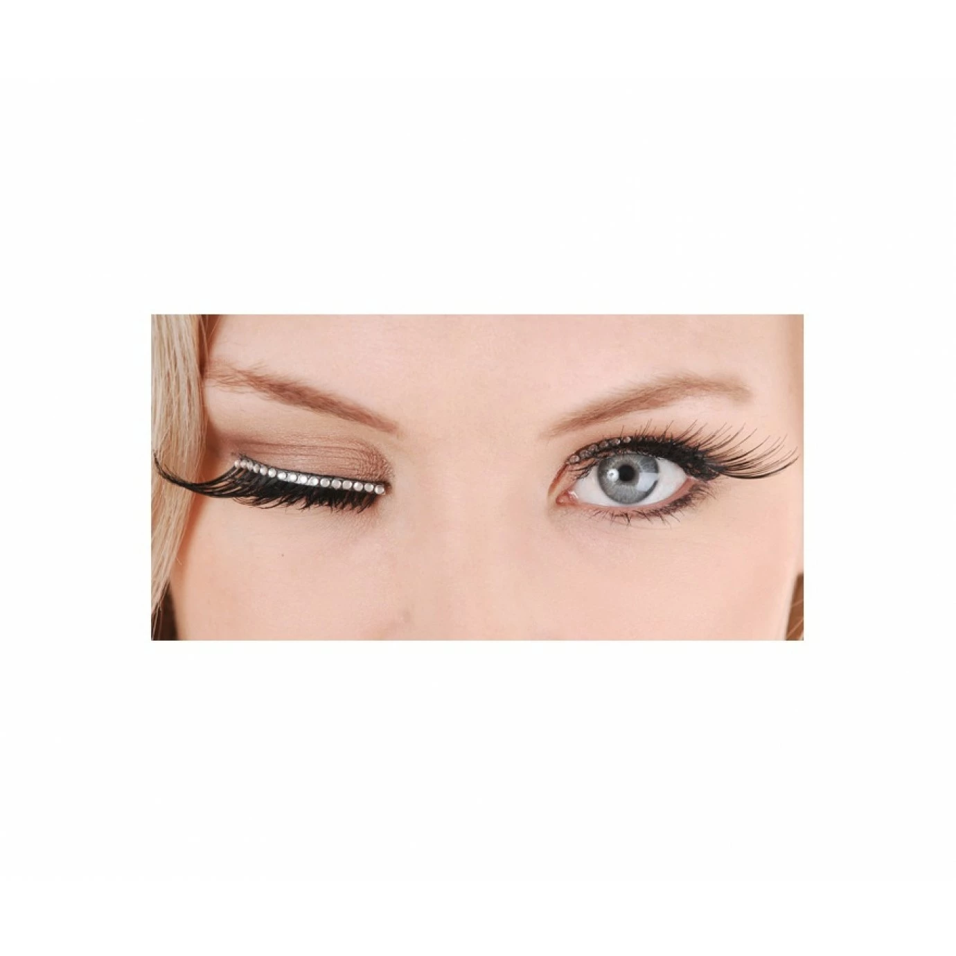 Sweeping black lashes with small diamantes place along the upper eyelid line. Adhesive is included.