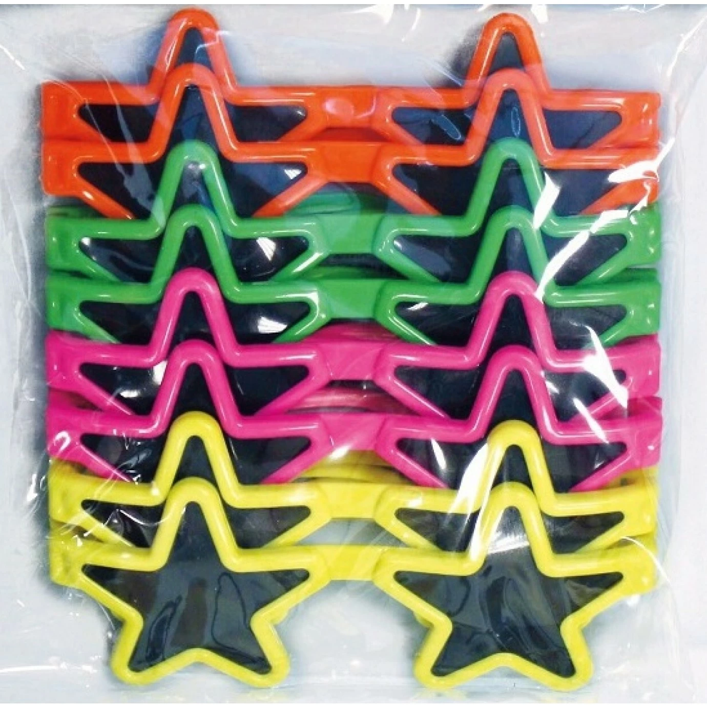 Pack includes 8 pairs of plastic sunglasses in a mix of green, magenta, orange and yellow.