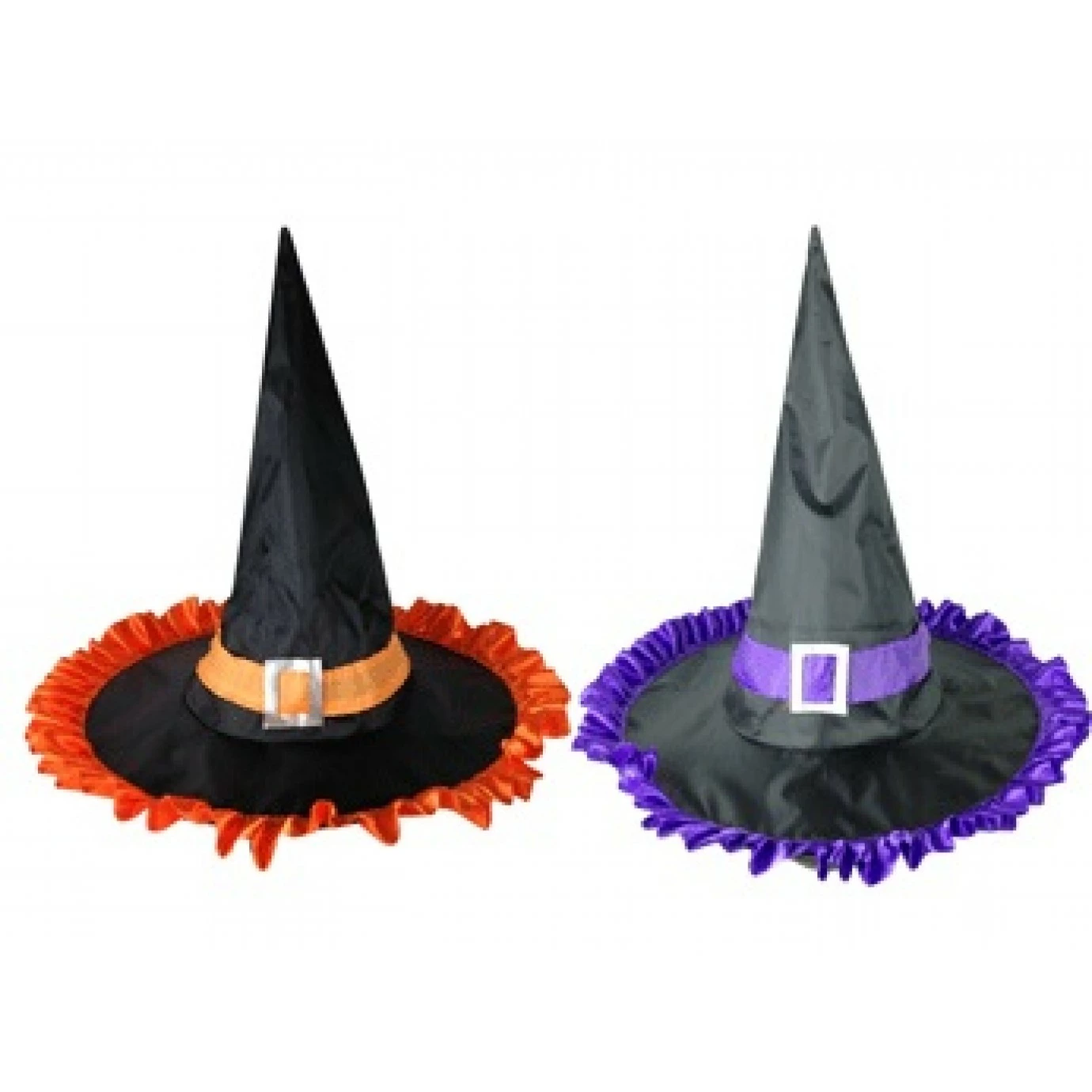Witch hats are made from black polyester and feature either purple or orange ruffle trim around the brim and matching hat band. One size fits most adults. Available in orange or purple. If you have a preference for a particular colour you can state this in your order notes however if no preference is stated or one colour is unavailable we will send your order with the available colour instead.