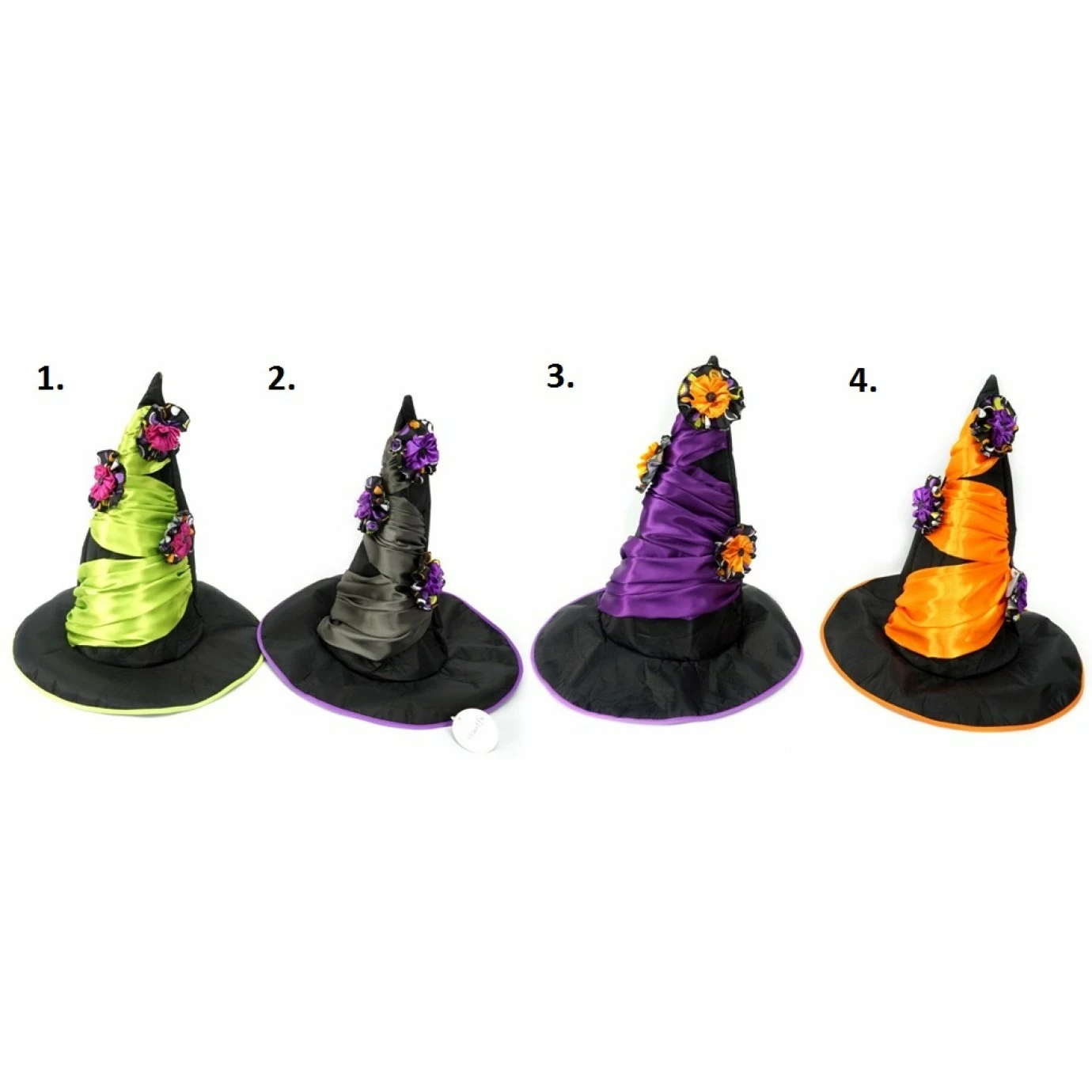 Hats are made from polyester and feature floral embellishments up the sides.