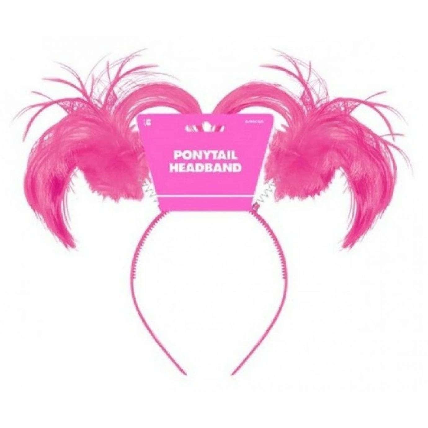 Headband is made from flexible plastic and features attached metal springs with synthetic hair and foil tinsel decoration.