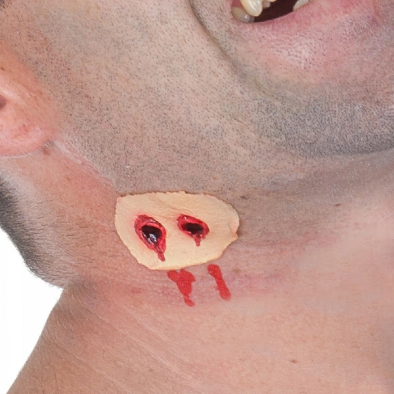Latex piece is skin colour featuring two puncture type holes with dried blood effects. Combine with make up, spirit gum and fake blood to create a realistic look! Latex wound measures approximately 3 cm in diameter.