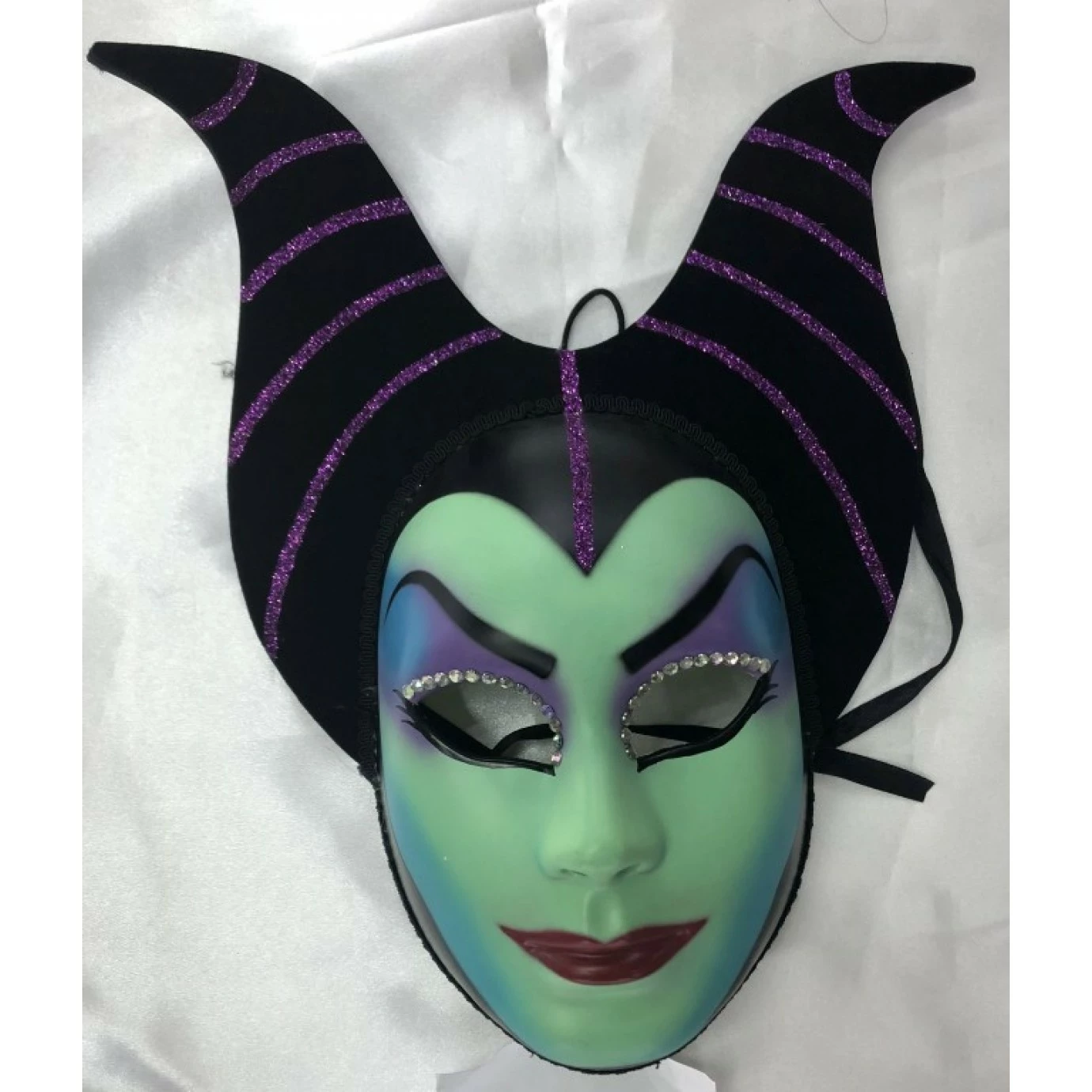 Mask is made from plastic with attached foam horns, plus glitter and faux rhinestone decoration.