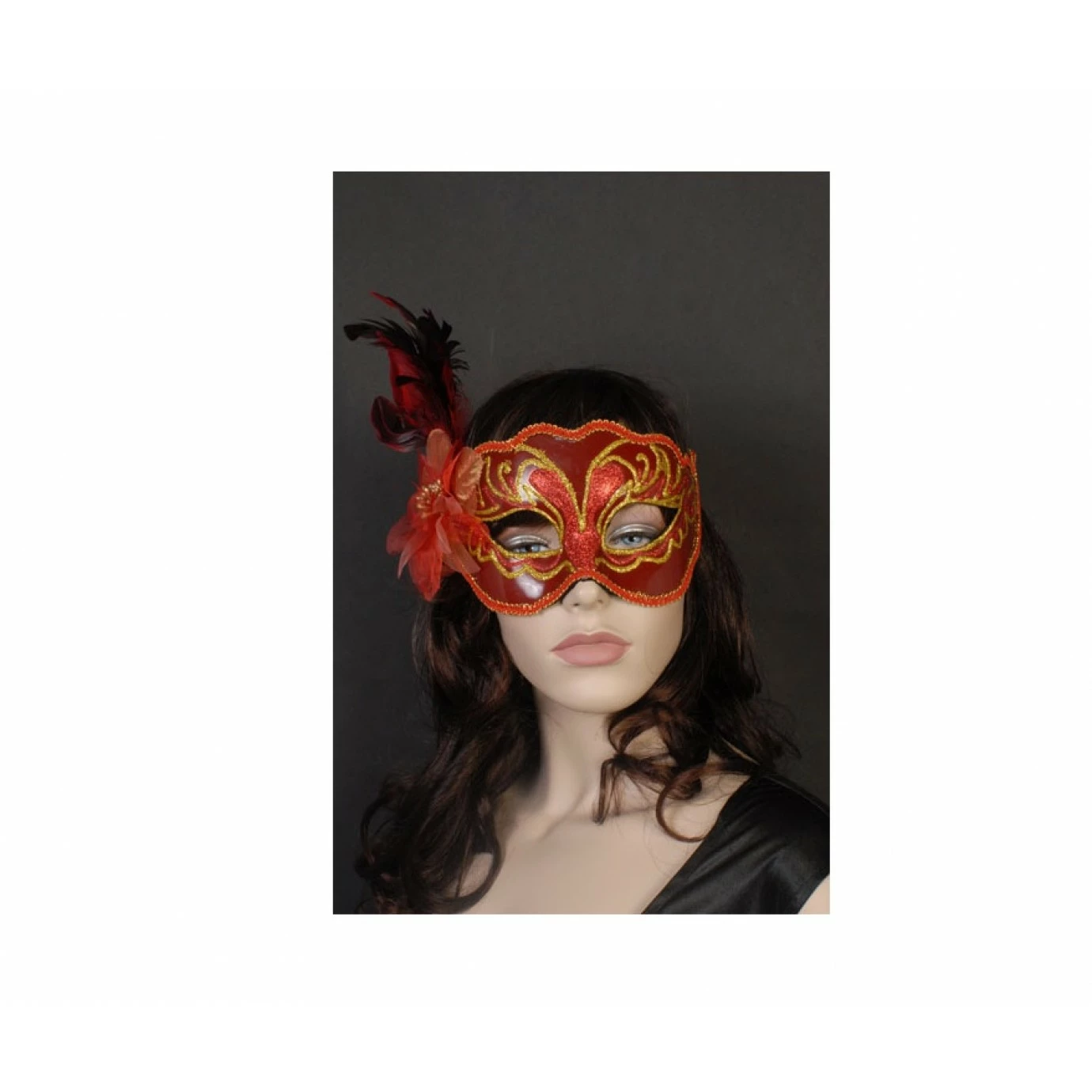 Matt ruby mask with red trim around face and red and gold glitter feature around eyes.