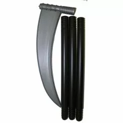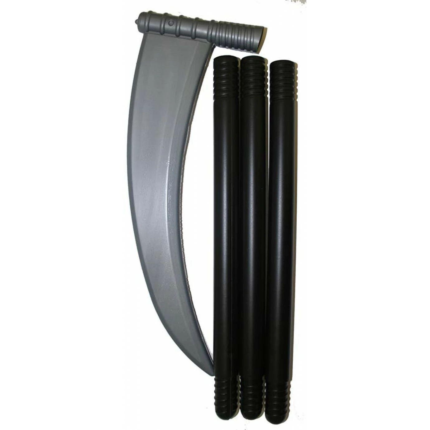 A plastic scythe toy with grey ‘blade’ and black handle. Comes in four parts that join together to make the full length scythe.
