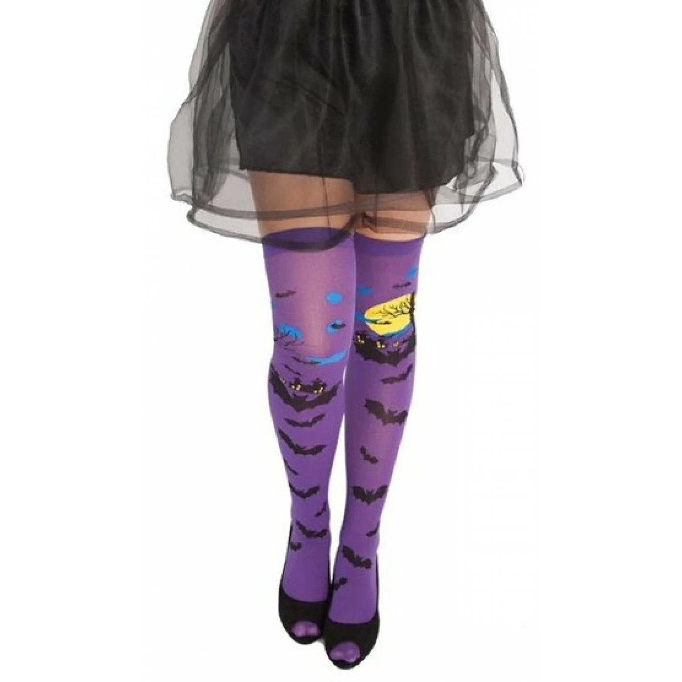 A pair of purple thigh high stockings with a Halloween themed print.
