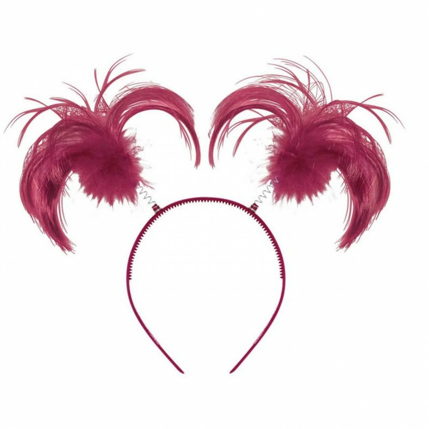 One size fits all headband made from maroon plastic with two tinsel adorned pigtails attached to springs.