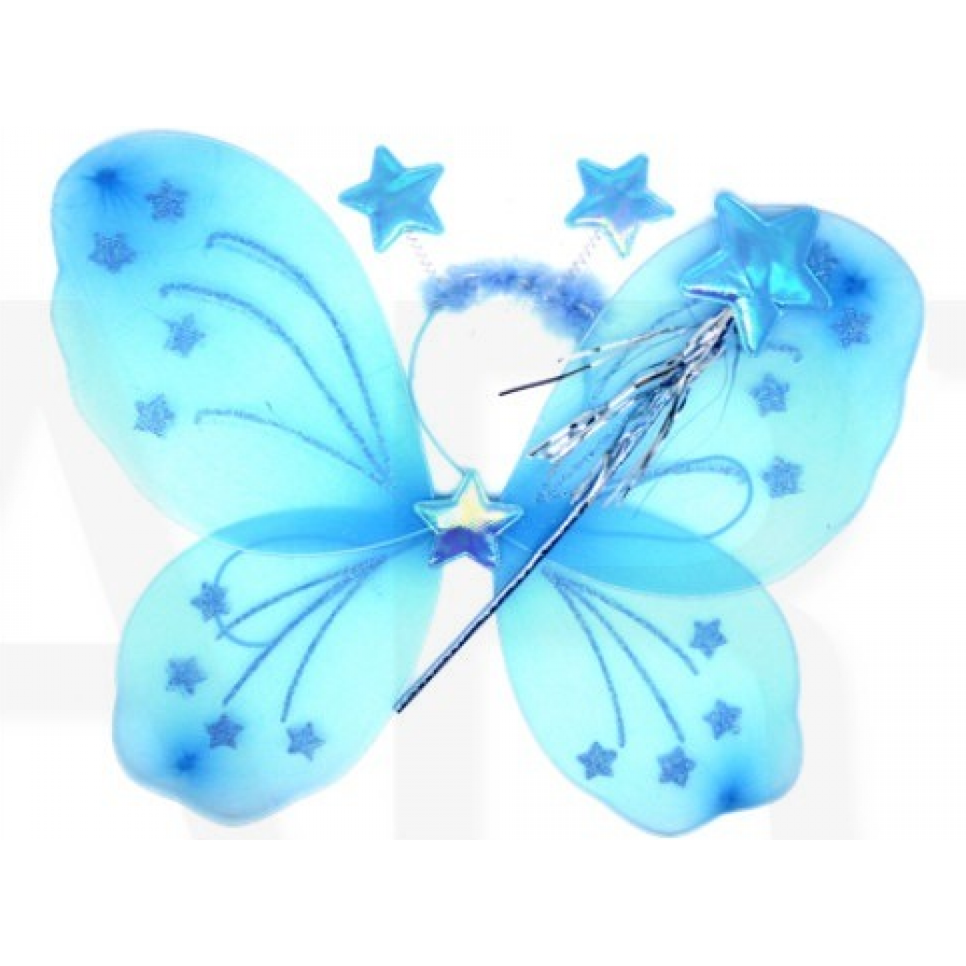 This set includes one pair of butterfly wings with elastic to wear, one wand and a headband with stars.