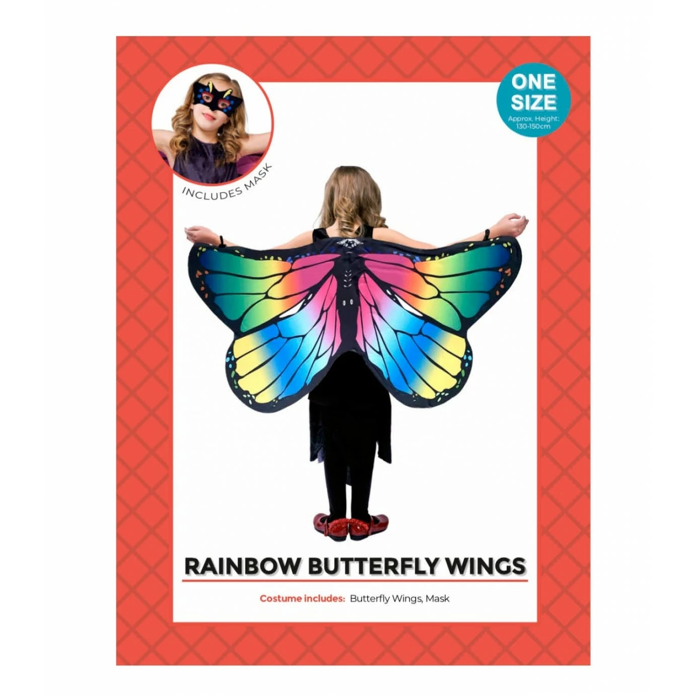This pack includes one pair of butterfly wings with elastic around the arms and the wrists for the wings to flutter. Also includes a felt mask with elastic to go around the head.